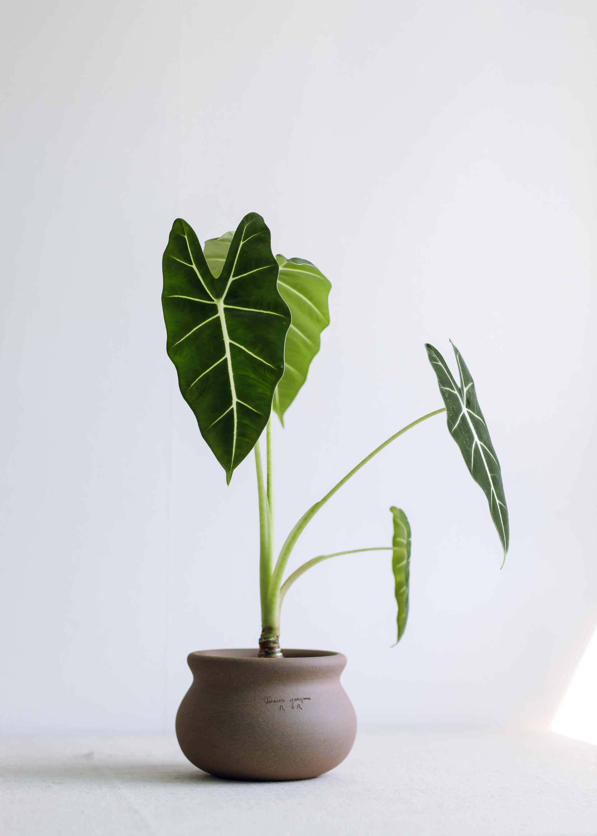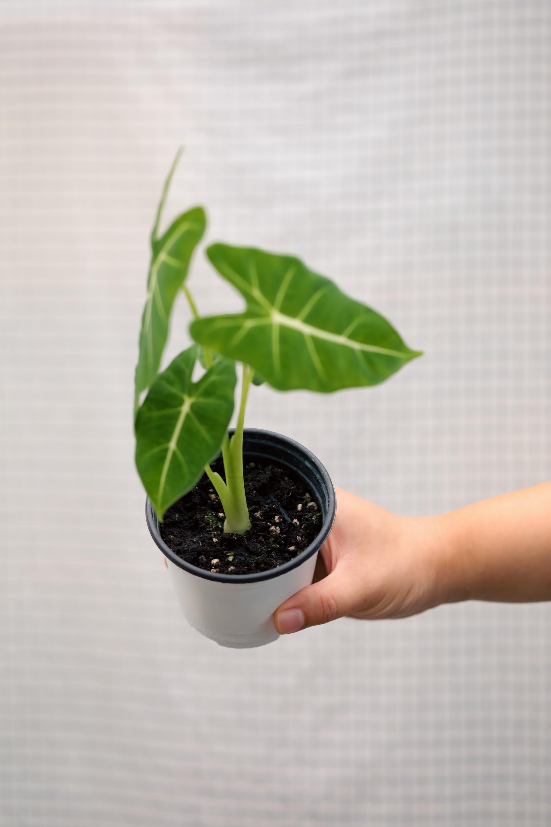 알로카시아 프라이덱은 벨벳 질감의 암녹색 잎과 하얀 잎맥이 대조되어 멋진 식물이에요.